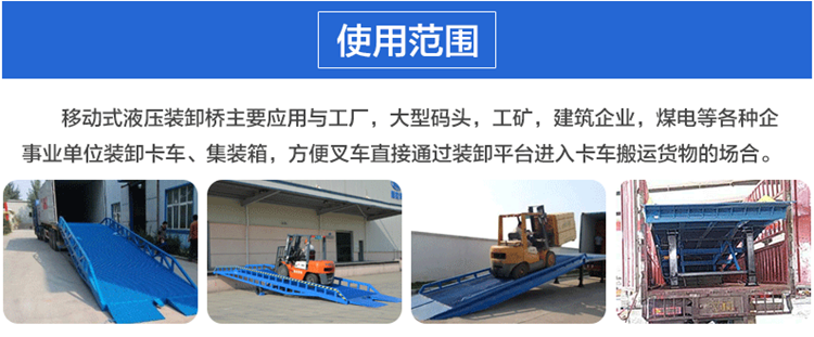 移動(dòng)式液壓登車橋移動(dòng)式液壓登車橋移動(dòng)式液壓登車橋移動(dòng)式液壓登車橋是與叉車配合使用的貨物裝卸輔助設(shè)備,可根據(jù)汽車車廂的高低調(diào)節(jié)高度,叉車可以直接通過本設(shè)備駛?cè)胲噹麅?nèi)部進(jìn)行貨物的批量裝卸,僅需單人作業(yè),即可實(shí)現(xiàn)貨物的快速裝卸。它使企業(yè)減少大量勞力,提高工作效率,獲取更大經(jīng)濟(jì)效益。